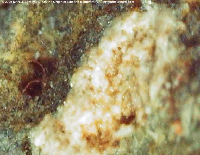 The rock was on earth for 250 - 300 million years, so it is possible that indigenous microscopic earth life forms, 1000 X smaller, but morphologically identical to their larger counterparts on earth, inhabited the surface of the rock, and at some point were immaculately preserved by a instantaneous fossilization event. However, the probability is extremely small. Add to that the ecosystem itself seen on the rock, which includes 10 legged beaked spiders, 3 fingered rodents, treeless fruit that grows directly from the ground, and life forms that eat and accumulate metal, etc , and the probability that the life forma are terrestrial is infinitesimal.